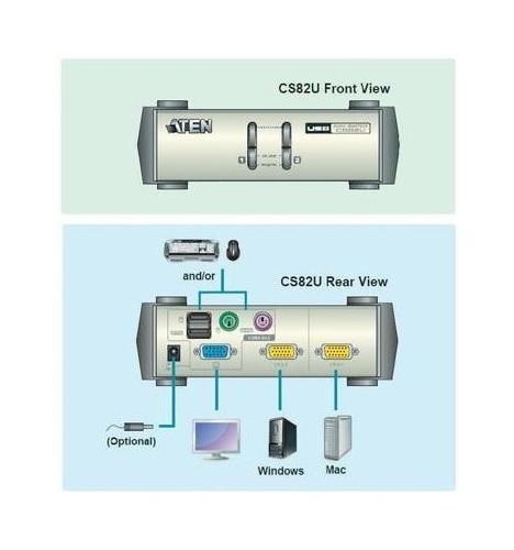 КВМ-переключатель PS/2-USB CS82U – настольное устройство, обеспечивающее пользователям доступ к двум компьютерам с одной КВМ-консоли (клавиатуры и мыши PS/2 или USB и VGA-монитора). CS82U поддерживает новую технологию ATEN – Video DynaSync™, позволяющую обойти проблемы с дисплеем при загрузке и оптимизирующую разрешение экрана. Коммутатор не требует настройки – достаточно просто вставить кабели в соответствующие порты.