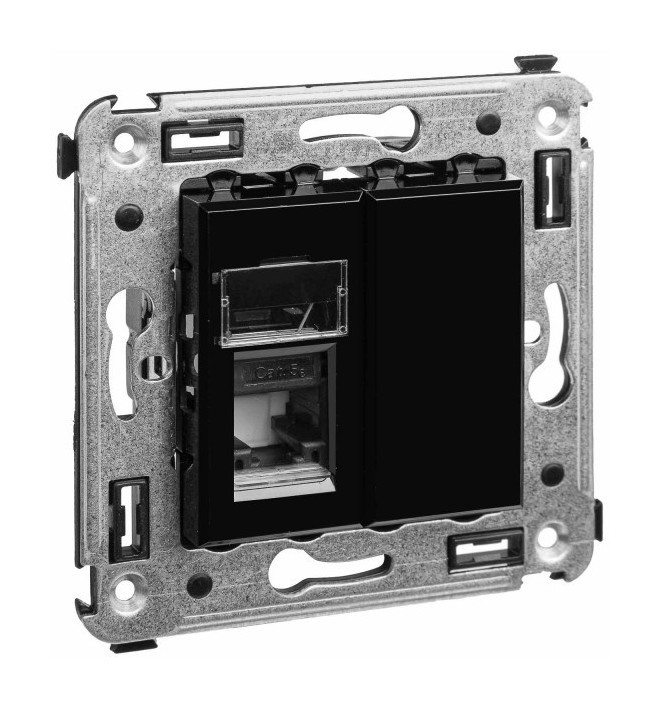 Компьютерная розетка двойная используется для подключения компьютерной техники или же соединения с патч-панелью. Компьютерная розетка предназначена для скрытого монтажа в стену. Розетка RJ-45 категории 5e – это наиболее популярная на сегодняшний день модель. Она позволяет организовать сеть с частотой 125 МГц и скоростью до 1000 Мбит/с. Материал – металл, термопласт. Пластиковые части устройства имеют оттенок "Черный квадрат" – самый глубокий, таинственный и многогранный оттенок из всей палитры цветовых решений "Avanti".
