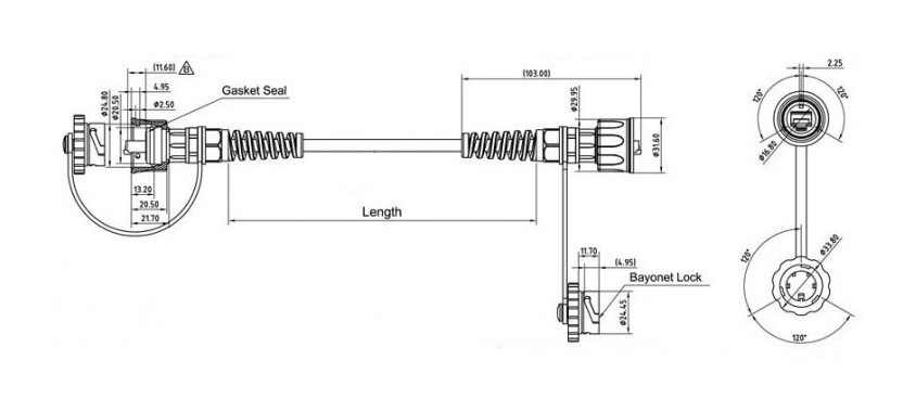 | Особенности конструкции | Кабель повышенной гибкости с оболочкой, устойчивой к неблагоприятным условиям Корпус из термопластика с байонетным замком и защитной крышкой Гибкий хвостовик защищает кабель от чрезмерного изгиба |