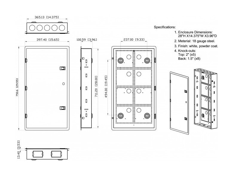 Hyperline Шкаф настенный с передними петлями, для скрытого монтажа, 28"(711.2) x 365.1 х 100.6 мм (ВхШхГ), белый 1 шт.