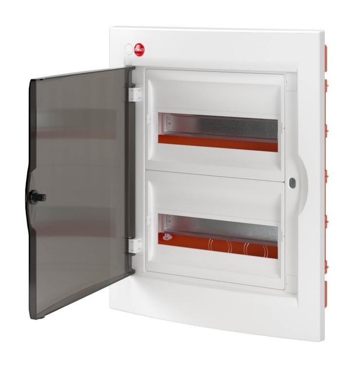 Встраиваемый распределительный щиток ДКС предназначен для монтажа в жилых и административных помещениях для установки автоматических выключателей любых производителей: таймеров, устройств защитного отключения и управления освещением и т.д. Щиток имеет оцинкованную DIN-рейку и суппорт, заглушки для пустых модулей, сборочные винты и заглушки для них, самоклеящуюся этикетку для маркировки цепей. Межосевое расстояние между рядами 125-150-175 мм. Преперфорированные отверстия и насечки на задней стенке обеспечивают точное соединение с пластиковыми трубами и обеспечивают легкий монтаж. Дверца выполнена из затемненного полупрозрачного пластика. Специальная конструкция петель дает возможность открывать дверцу более чем на 180°. Степень пыле- и влагозащиты IP 41. Количество модулей - 24. Параметры щитка: ширина - 345 мм, высота - 425 мм, глубина встраиваемой части - 77 мм. Материал - термостойкий и ударопрочный пластик. Цвет - белый.