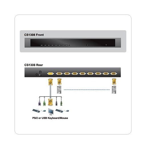 8-портовый KVM переключатель CS1308 – устройство управления, которое обеспечивает доступ к 8 компьютерам с одной консоли (клавиатура, мышь, монитор), а при подключении каскадом* 8 дополнительных KVM переключателей CS1308 можно управлять 64 компьютерами. Переключатель поддерживает интерфесы USB и PS/2 для подключения консоли и компьютеров.