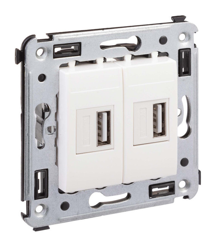 USB зарядное устройство предназначено для скрытого монтажа в стену и рассчитано на номинальный ток 2,1, номинальное напряжение от 220 до 250 В. Пластиковые части устройства имеют цвет "Белое облако" – этот светлый оттенок ассоциируется с легкостью, воздушностью и чистотой и сочетается с любыми цветами. Глянцевый блеск придает конструкции стильный внешний вид. Изделие имеет два модуля. Материал: металл, термопласт.