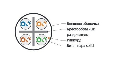 | Особенности | Состоит из 4-х неэкранированных витых пар, разделенных крестообразным разделителем. |