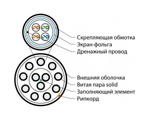 Применение Вне помещений. Построение магистральной подсистемы СКС категории 5 в условиях повышенных электромагнитных помех, влаги и УФ излучения. Применяется для прокладки в кабельной канализации, шахтах и коллекторах. Может прокладываться снаружи стен зданий и сооружений. Передача сигналов 100 Мбит/с на частоте до 100 МГц Поддерживаемые приложения 10–100 Мбит/с Ethernet (10BASE-T, Fast 100BASE-TX), ATM-622 Мбит/с, 100VG-AnyLAN, Token Ring, другие приложения кабельных систем категории 5