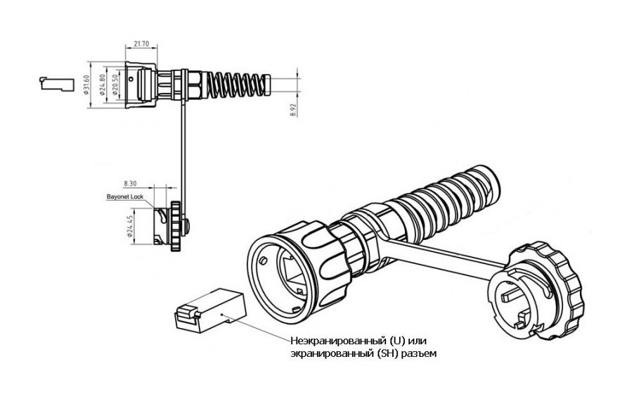 | Особенности | Корпус из термопластика с байонетным замком и защитной крышкой. Соответствует стандартам ANSI/TIA/EIA-568-B.2-1, ISO/IEC 11801 для категории 6 Соответствует стандарту IEC 60529 (степень защиты IP67) Стандарт пожарной безопасности UL 1863 |