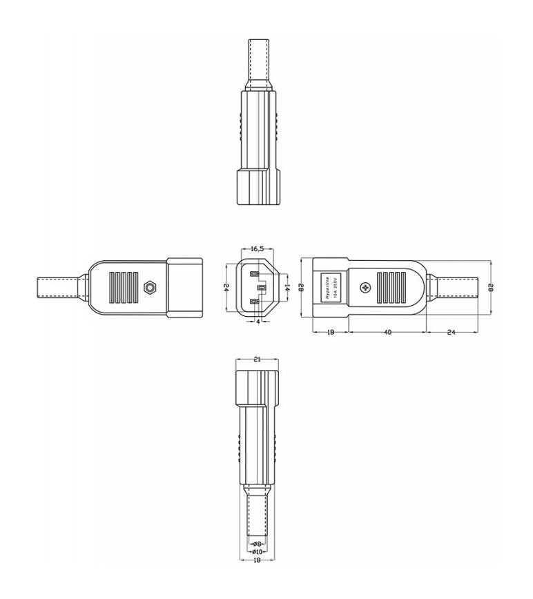 Hyperline Разъем IEC 60320 C14 220В 10A на кабель (плоские выступающие штыревые контакты в пластиковом обрамлении), прямой