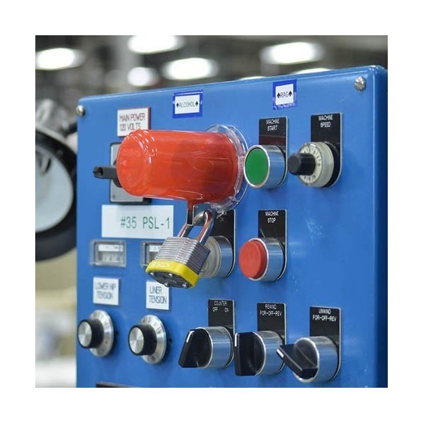 BRADY Блокиратор пусковой/аварийной кнопки малый (до 16 мм), красный, 80мм х 64мм х 9мм. (в комплекте три наклейки: прозрачная, желтая, красная)
