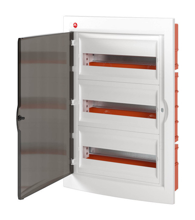 Встраиваемый распределительный щиток ДКС предназначен для монтажа в жилых и административных помещениях для установки автоматических выключателей любых производителей: таймеров, устройств защитного отключения и управления освещением и т.д. Щиток имеет оцинкованную DIN-рейку и суппорт, заглушки для пустых модулей, сборочные винты и заглушки для них, самоклеящуюся этикетку для маркировки цепей. Межосевое расстояние между рядами 150-175-200 мм. Преперфорированные отверстия и насечки на задней стенке обеспечивают точное соединение с пластиковыми трубами и обеспечивают легкий монтаж. Дверца выполнена из затемненного полупрозрачного пластика. Специальная конструкция петель дает возможность открывать дверцу более чем на 180°. Степень пыле- и влагозащиты IP 41. Количество модулей - 54. Параметры щитка: ширина - 455 мм, высота - 650 мм, глубина встраиваемой части - 97 мм. Материал - термостойкий пластик. Цвет - белый.